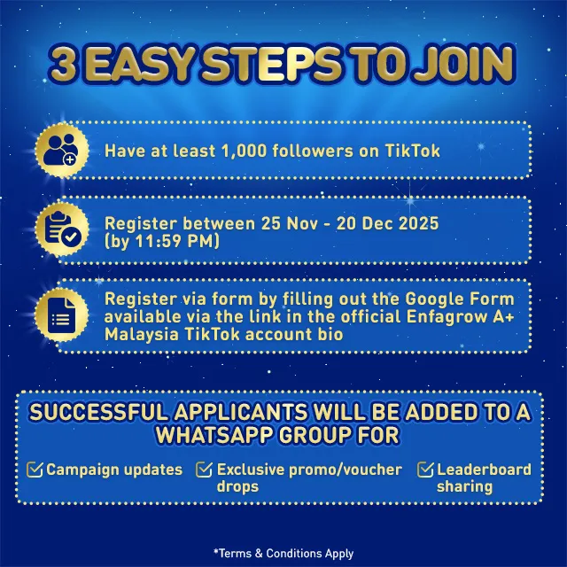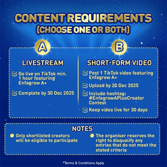 🎉 Hey Malaysian Creators! Join the Enfagrow A+ Creator Contest & Win Big! 🎥✨ Ready to inspire parents through powerful content? Whether you shine on Livestream or love crafting Short Videos, this is your moment to stand out! 📅 Contest Period: 25 Nov - 31 Dec 🎁 RM6,449* Worth of Prizes Up for Grabs! ✨ Create. Share. Win. Inspire families, grow your reach, and stand a chance to walk away with amazing rewards! Let’s grow together with A+ Nutrition for Higher Intelligence 💛 Register now: bit.ly/EnfagrowAPlusCreatorContest *T&Cs Apply. #EnfagrowAPlusMY #APlusCreatorContest #CreateToWin #MyCreators #ParentingJourney