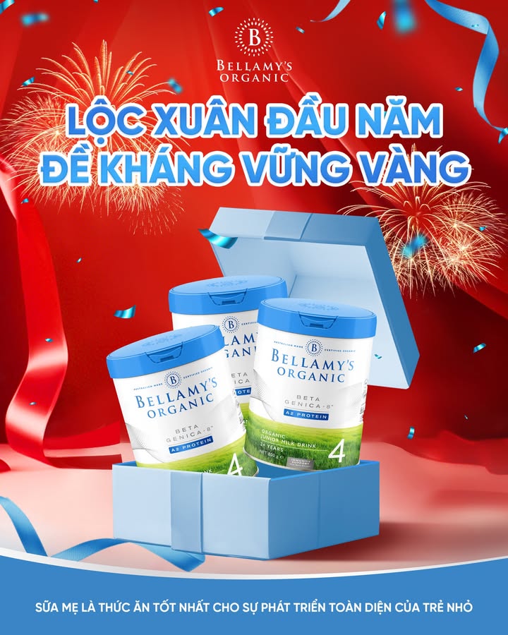 BELLAMY'S ORGANIC A2 PROTEIN - LỘC XUÂN ĐẦU NĂM, ĐỀ KHÁNG VỮNG VÀNG 🛡️ Năm mới thêm tuổi mới, bé háo hức đón chào những chuyến đi chơi xuân và khám phá. Trọn vẹn niềm vui ấy, mẹ càng mong con có một “lá chắn” đề kháng thật vững chắc để tự tin đón nhận mọi điều mới mẻ. Bellamy's Organic A2 Protein số 4 chính là người bạn đồng hành đáng tin cậy, với công thức toàn diện hỗ trợ miễn dịch: 🍄 Wellmune® Beta-Glucan từ nấm men: “Chiến binh miễn dịch” tự nhiên, được nghiên cứu hỗ trợ tăng cường hoạt động của các tế bào miễn dịch, giúp cơ thể sẵn sàng phòng vệ. 🛡️ Hệ Synbiotics kép (Prebiotics + Probiotic BB-12™): Chăm sóc đường ruột khỏe mạnh – nơi chứa đến 70% hệ miễn dịch, tạo nền tảng đề kháng bền vững từ bên trong. 🐄 Đạm A2 hữu cơ dễ tiêu: Giảm áp lực cho hệ tiêu hóa, giúp cơ thể tập trung năng lượng cho hệ phòng thủ. Trao cho con “lộc xuân” đầu năm là sức khỏe dồi dào, mẹ nhé! #BellamysOrganic #ForeverVietnam