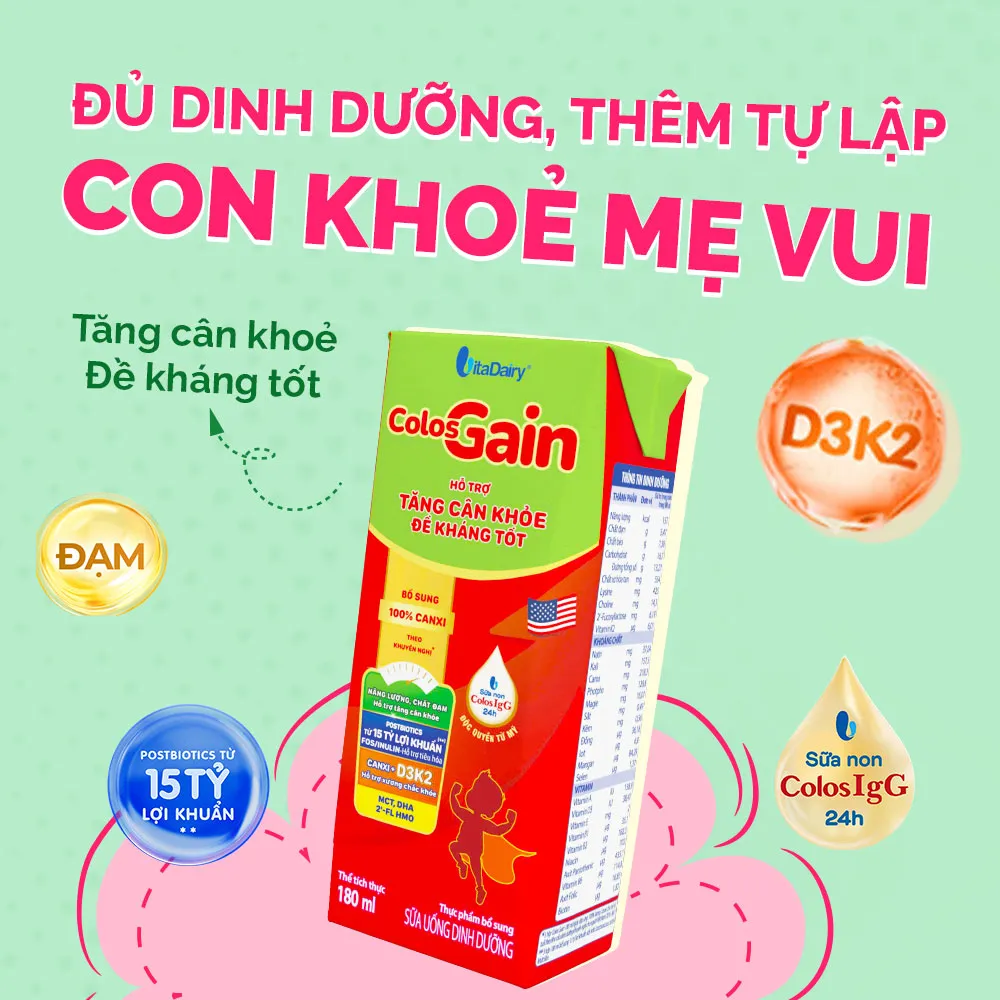 🥰COLOSGAIN PHA SẴN - DINH DƯỠNG TOÀN DIỆN CÙNG CON HỌC ĐIỀU HAY Từ việc tự bỏ hộp sữa vào balo, tự chăm chút bản thân, đến tự tin chào hỏi… mỗi ngày con học thêm một kỹ năng nhỏ, lớn lên thêm từng chút một. Sữa bột pha sẵn ColosGain đồng hành cùng con đến lớp, giúp tăng cân khỏe, đề kháng tốt nhờ dinh dưỡng toàn diện, siêu cộng hưởng lớn khôn: ✨Công thức đột phá với Postbiotics từ 15 tỷ lợi khuẩn, kết hợp bộ đôi HMO & FOS giúp hệ tiêu hóa của bé luôn khỏe mạnh, hấp thu dưỡng chất tối đa từ bữa ăn chính. ✨Sữa non ColosIgG 24h kết hợp cùng Kẽm, Selen và Vitamin nhóm B & C giúp bé tăng cường hệ miễn dịch hiệu quả, bảo vệ con yêu khỏi tác nhân gây bệnh. ✨Vitamin D3K2 cùng Canxi được bổ sung đầy đủ, giúp xương chắc khỏe, hỗ trợ phát triển chiều cao. ✨Thêm vào đó là DHA, Choline và Taurine hỗ trợ con phát triển trí não. Mỗi ngày “rột rột” 2 đến 3 hộp ColosGain pha sẵn, con thêm cao khỏe, phát triển toàn diện hơn từng chút một 💛 ---------------------------------- VITADAIRY - VÌ CON MẸ CHỌN 📞Tư vấn dinh dưỡng: 1900 633 559 ➡️YouTube: https://bit.ly/30hUmzG ➡️TikTok: https://www.tiktok.com/@vitadairyvietnam #ColosGain #Tangcankhoe_DeKhangtot #ColosGainCongThucCaiTienMoi #VitaDairy2026
