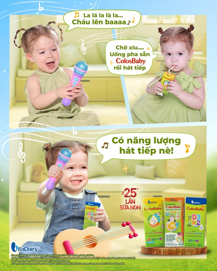TUNG TĂNG HÁT CA CÙNG EM BÉ LISA NÀO 🎤🎶 Chỉ với 2 – 3 hộp ColosBaby pha sẵn, Lisa đã có thêm năng lượng để tung tăng khắp nhà, vừa chơi vừa hát “la lá la…” thật hồn nhiên. 💚 Nhờ mẹ tin chọn ColosBaby, Lisa được bổ sung sữa non ColosIgG 24h cùng các dưỡng chất cần thiết: ✅ 𝐇𝐨̣̂𝐩 𝐩𝐡𝐚 𝐬𝐚̆̃𝐧 𝐂𝐨𝐥𝐨𝐬𝐁𝐚𝐛𝐲 𝐆𝐨𝐥𝐝 𝐜𝐚̉𝐢 𝐭𝐢𝐞̂́𝐧: Với 𝐗𝟐.𝟓* lần sữa non ColosIgG 24h chứa hàm lượng kháng thể IgG cao, nhập khẩu độc quyền từ Mỹ hỗ trợ con đề kháng vững vàng ✅ 𝐇𝐨̣̂𝐩 𝐩𝐡𝐚 𝐬𝐚̆̃𝐧 𝐂𝐨𝐥𝐨𝐬𝐁𝐚𝐛𝐲 𝐆𝐨𝐥𝐝 𝐃𝟑𝐊𝟐: Bộ ba 𝐂𝐚𝐧𝐱𝐢 – 𝐃𝟑 – 𝐊𝟐 giúp đáp ứng nhu cầu khuyến nghị, đảm bảo phát triển hệ xương, răng chắc khỏe, phòng ngừa các dấu hiệu thiếu canxi ở trẻ nhỏ. ✅ Kết hợp cùng đạm Whey và chất béo MCT dễ hấp thu, giúp con tiêu hóa tốt hơn và tăng cân khỏe mạnh mỗi ngày. ✅ Cùng với Kẽm, Selen, Vitamin & Khoáng chất giúp hỗ trợ tăng cường đề kháng, bảo vệ con khỏi các tác nhân gây bệnh ---------------------------------- VITADAIRY - VÌ CON MẸ CHỌN 📞Tư vấn dinh dưỡng: 1900 633 559 ▶️YouTube: https://bit.ly/30hUmzG ▶️TikTok: https://www.tiktok.com/@vitadairyvietnam #ColosBaby #ColosBabyGoldCaiTien #ColosBabyGoldD3K2 #tangcuongdekhang #tangcankhoemanh