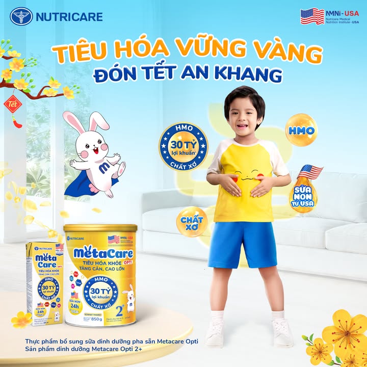 TIÊU HÓA VỮNG VÀNG, ĐÓN TẾT AN KHANG Tết đến, lịch nghỉ ngơi, vui chơi và di chuyển khiến cho chế độ ăn uống và sinh hoạt của trẻ cũng ít nhiều bị xáo trộn. Giờ ăn thất thường, thực phẩm giàu đạm và chất béo hơn thường ngày dễ khiến hệ tiêu hóa còn non nớt của trẻ bị quá tải, giảm khả năng hấp thu dinh dưỡng, từ đó, ảnh hưởng tới sức khỏe tổng thể. Đừng để ngày Tết kém vui vì chiếc bụng không “êm”. Thấu hiểu, hệ tiêu hóa khỏe chính là nền tảng để trẻ hấp thu đầy đủ dưỡng chất, duy trì thể trạng khỏe mạnh và tinh thần vui vẻ, Nutricare mang tới cho các ba mẹ giải pháp tăng cường sức khỏe hệ tiêu hóa, bé thả ga đón Tết. - Đột phá công nghệ lợi khuẩn Postbiotic với 30 tỷ Lợi Khuẩn, cùng HMO và chất xơ, giúp cân bằng hệ vi sinh đường ruột, tiêu hóa khỏe, giảm táo bón. - Công thức được bổ sung đạm Whey, Lysin và Kẽm, sản phẩm giúp kích thích vị giác bé ăn ngon miệng và tăng cân khỏe mạnh. - Bộ ba dưỡng chất Canxi, Vitamin K2, D3, giúp bé hấp thụ tối đa Canxi và phát triển chiều cao vượt trội. Tết này, muốn chăm bụng khỏe cho bé, ba mẹ nhớ chọn Metacare Opti! --- NUTRICARE - THƯƠNG HIỆU QUỐC GIA DINH DƯỠNG Y HỌC Website: https://nutricare.com.vn/ Youtube: https://goo.gl/VHYcKD Hotline: 1800.6011 (miễn phí cước) #ThuongHieuQuocGia #DinhDuongYHoc #Nutricare --- Sản phẩm dinh dưỡng Metacare Opti 2+ Thực phẩm bổ sung sữa dinh dưỡng pha sẵn Metacare Opti Sản xuất và chịu trách nhiệm sản phẩm bởi: CÔNG TY CỔ PHẦN DINH DƯỠNG NUTRICARE VPGD: Toà nhà Nutricare, Số 8, Khu A-TT2 Him Lam, Phường Hà Đông, TP. Hà Nội. Điện thoại: 024.66.833.368 Sản xuất tại: Chi nhánh Công ty Cổ phần Dinh dưỡng Nutricare Địa chỉ: Nhà máy 1 Lô VII.2 và Nhà máy 2: Lô V.11, Lô V.12, Khu công nghiệp Thuận Thành 3, Phường Trí Quả, Tỉnh Bắc Ninh, Việt Nam.